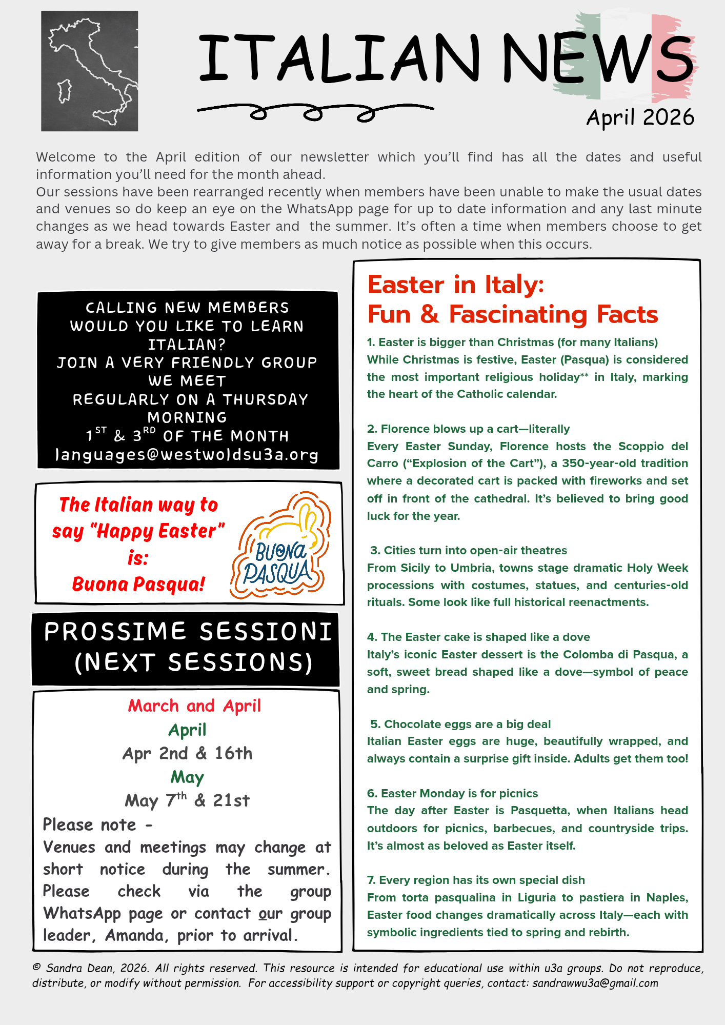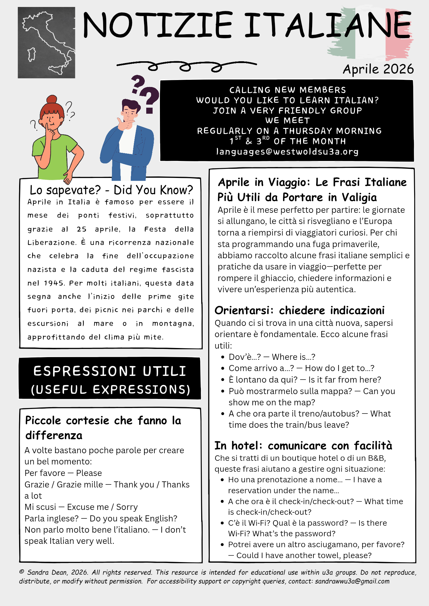 Here’s the April edition of our Italian newsletter with some lively Italian information, useful travel vocabulary and group meeting dates