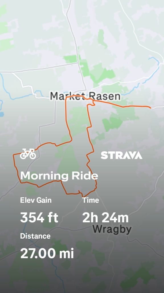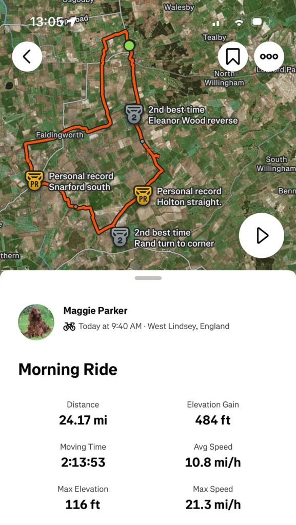 Wednesday 27th Angela tells us it was an all ladies ride today ( myself, Angela D, Sylvia, Helen and Shirley). We biked past the golf course, turned left at Little London, and left again at the bottom of Sixhills. Towards Willingham woods and into Tealby. We stopped for a cuppa and scones ect at Sunnyside. From there it was back through Dog Kennel woods, and back into Rasen past the golf course. Plus the weather was lovely. On Friday 29th Chris reports “Martin, Gary, Wilf and I set off from Tescos and headed towards Faldingworth to meet with Shirley on Friday. The weather was sunny with a brisk SW wind. We continued through to Snarford and headed to Wickenby airport cafe. After the usual excellent food and chatter we headed back to Friesthorpe and Faldingworth with Shirley and then headed back to Tescos via Linwood…..We all enjoyed Shirley’s infectious laughter throughout the journey”