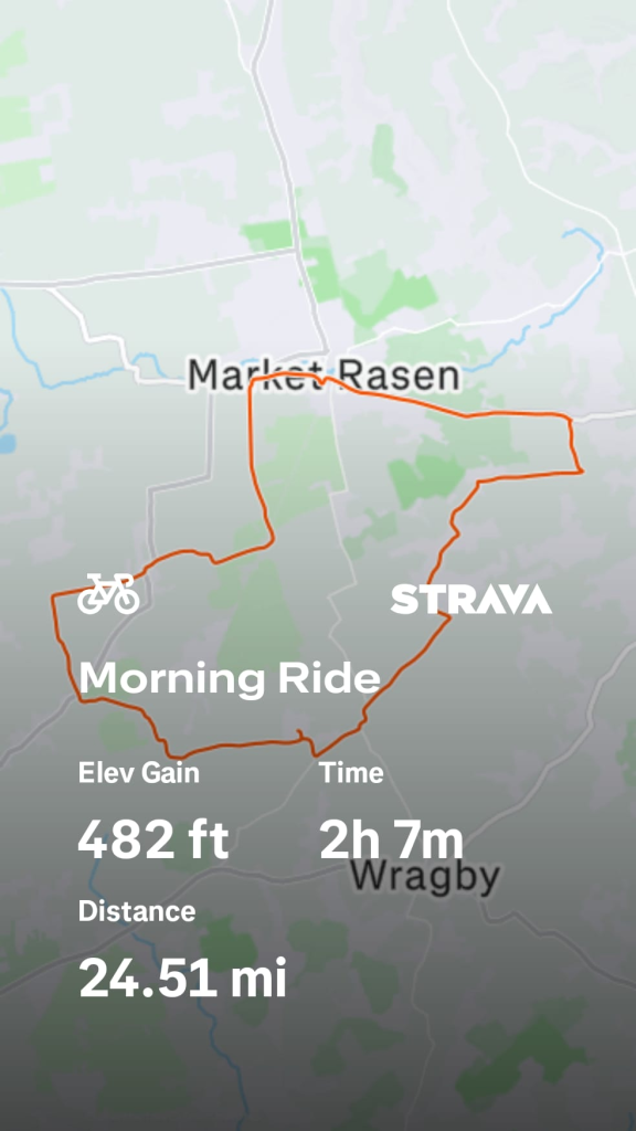 This was led by Angela and attended by 6 riders …. Angela, Sylvia, Gordon, Gary and Tom from J-Bridge. Riding from Mk Rsn to Linwood, Lissington an Wickenby where we were joined by Shirley. We stopped at Thornes in Rand and returned via Snelland to Wickenby then Lissingley Xing and back to our various starts.